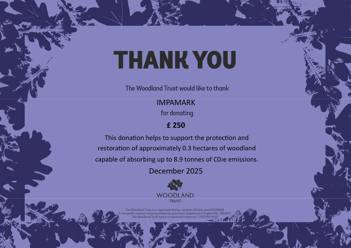 We made a donation of £500 in December 2023 and a further donation of £250 in December 2024 and 2025 help the pressures facing woods and trees from inappropriate development to climate change and allowing The Woodland Trust to secure important woodland habitats that are at risk.