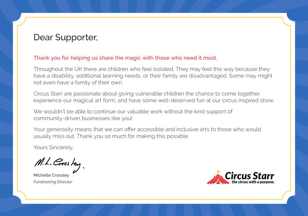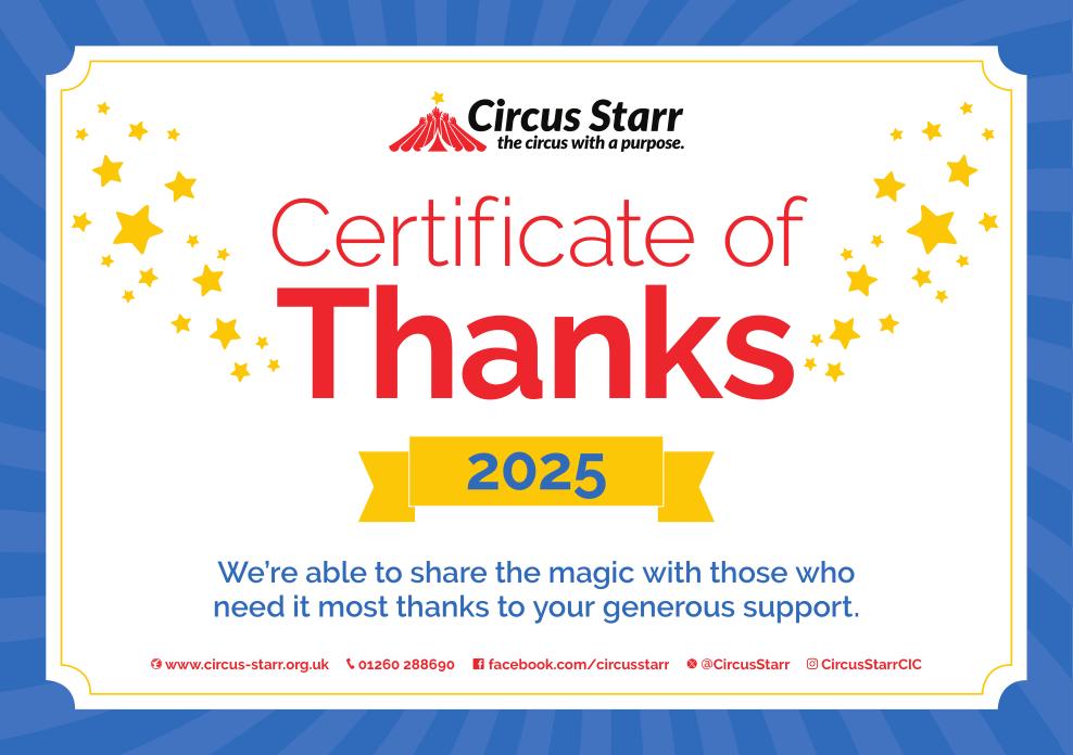 Circus Starr is a charity which tours the UK to bring circus fun to families and children with all different kinds of needs. This allows every child, regardless of who they are to be completely themselves and soak up the magic. For the last 3 years, we made donations to this fantastic cause which means that they can continue bringing joy to those who need it.